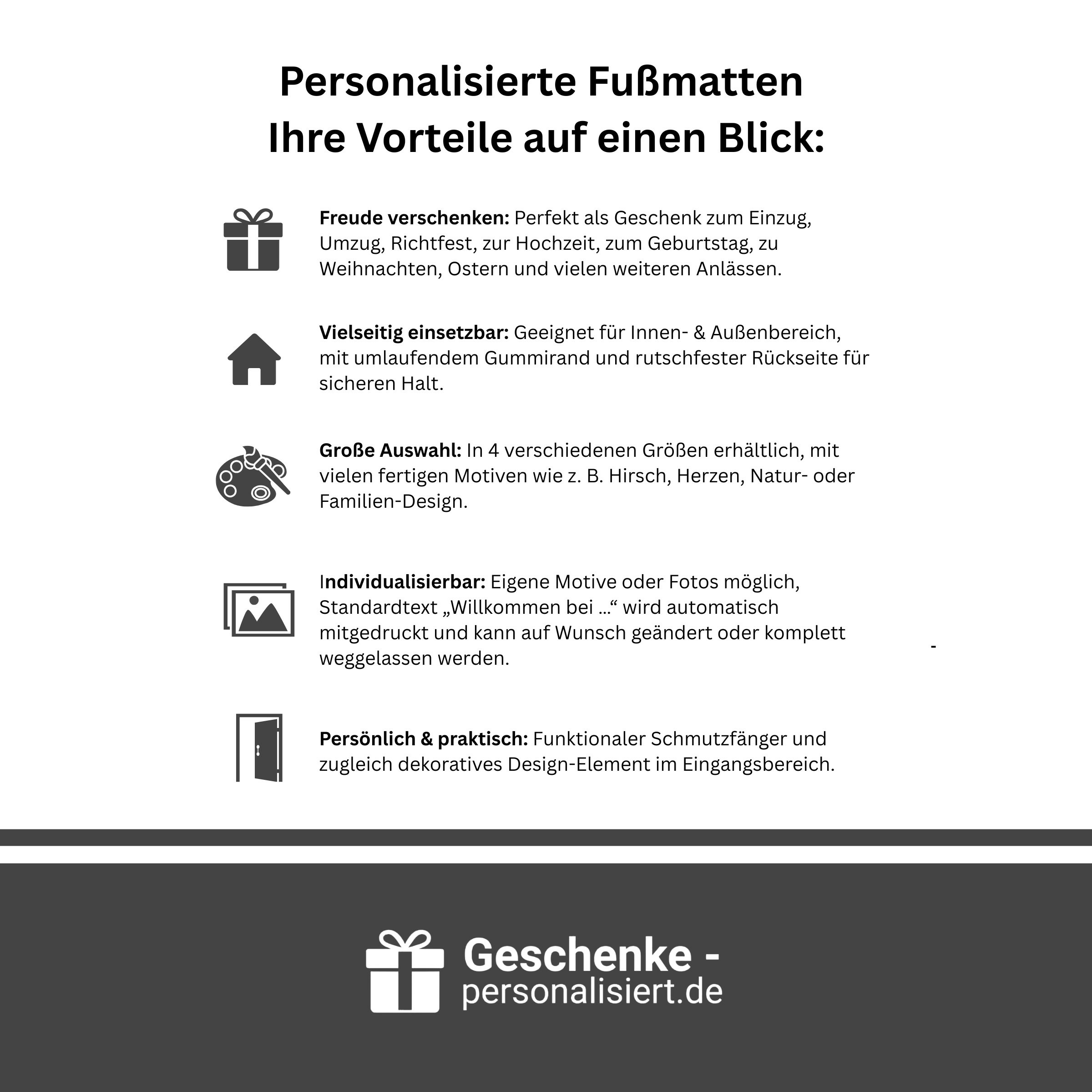 Eine Fußmatte personalisiert mit Namen ist eine originelle Geschenkidee für viele Anlässe: zum Einzug, zur Hauseinweihung, zur Hochzeit, zum Familienzuwachs oder als kleines „Willkommen in Deinem neuen Zuhause“. Für Naturburschen und Abenteurer ist die Unikatolo Hirsch-Fußmatte ein highlight – sie bringt ein Hauch Wald & Natur vor die Haustür und ist zum Beispiel eine tolle Idee für Jäger, Förster oder alle, die Berge, Wälder und Outdoor lieben.